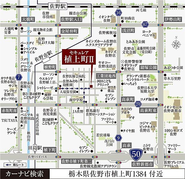 佐野藤岡IC、国道50号線「高萩」交差点へのアクセスも良く、交通利便性の良い住宅街に位置します。