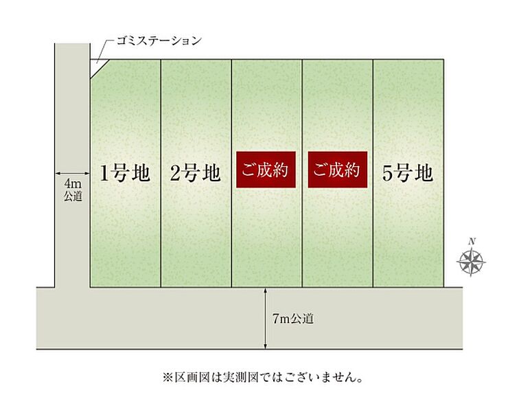 | 建物面積 | 97.70m2(1号地)、91.08m2(2号地)、97.70m2(5号地) | 土地面積 | 202.45m2(1号地)、203.79m2(2号地)、204.96m2(5号地) 私道負担なし |