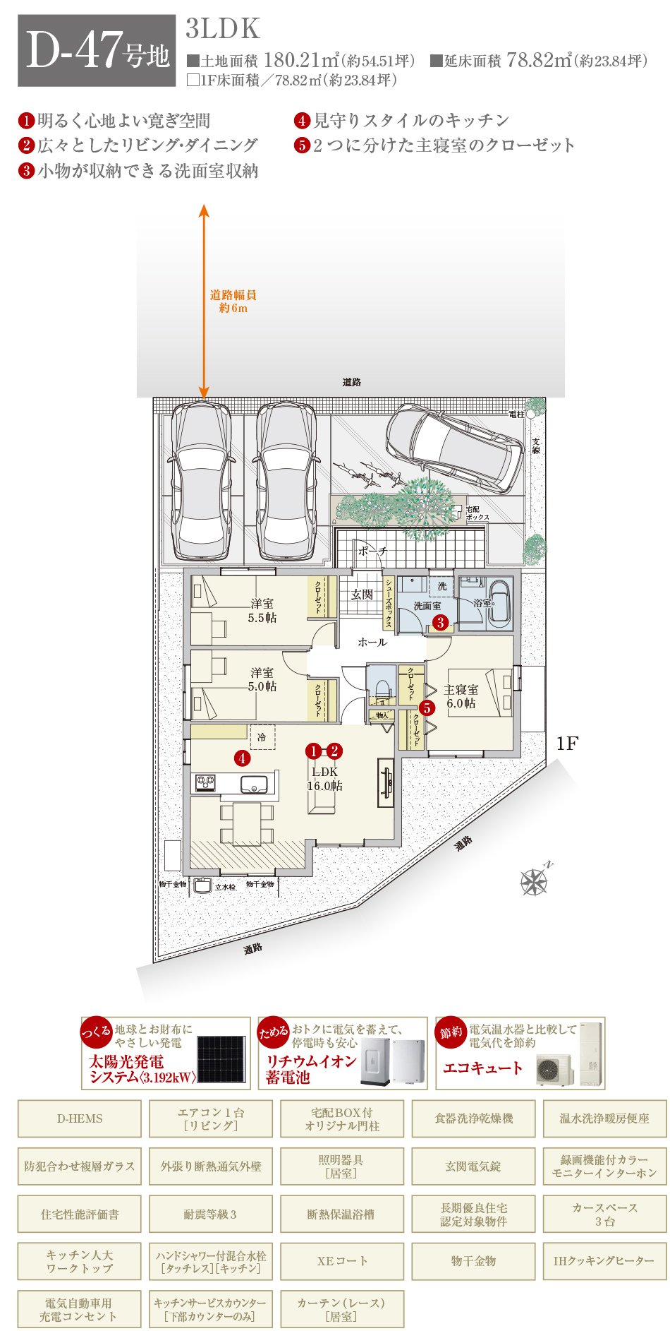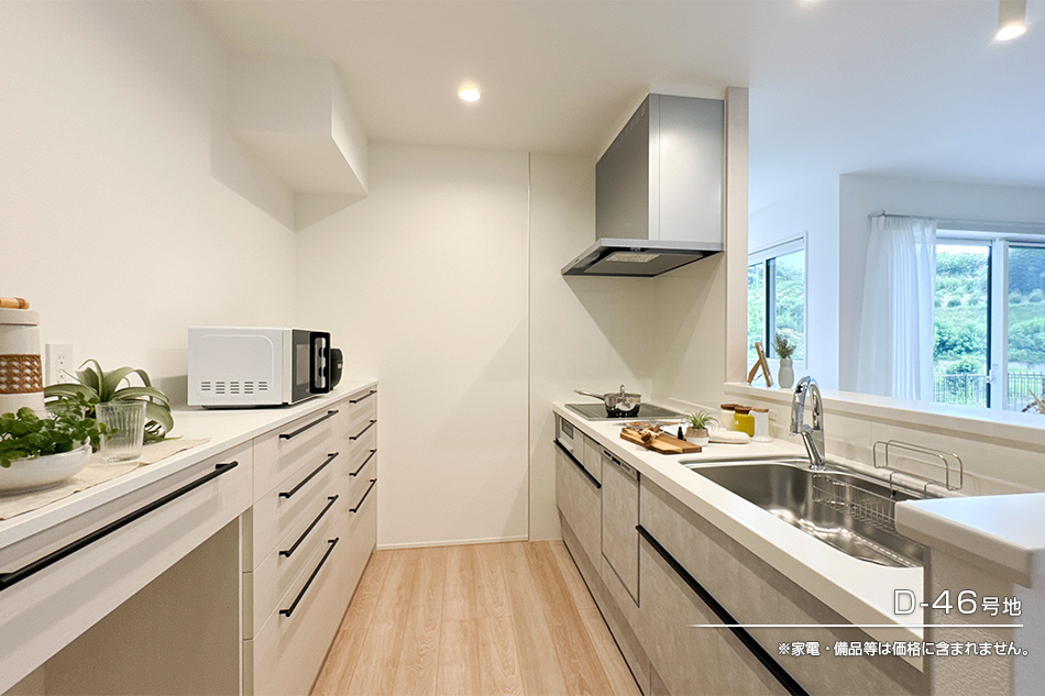 | 建物面積 | 78.32m2(D-46号地)、78.82m2(D-47号地) | 土地面積 | 180.96m2(D-46号地)、180.21m2(D-47号地) 全て私道負担なし |