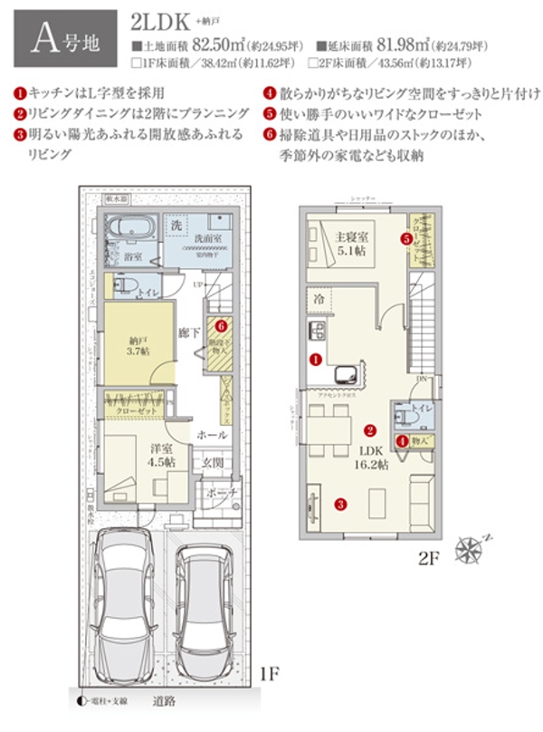| 建物面積 | 81.98m2(A号地)、81.98m2(B号地) | 土地面積 | 82.50m2(A号地)、82.57m2(B号地) 全て私道負担なし |