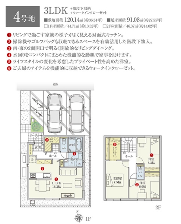 | 建物面積 | 91.08m2(4号地) | 土地面積 | 120.14m2(4号地) 私道負担なし |