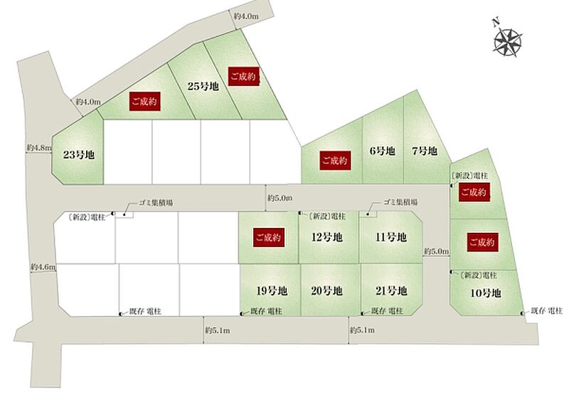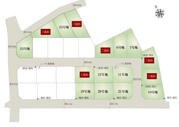 | 建物面積 | 84.46m2(25号地)~98.04m2(11号地) | 土地面積 | 108.44m2(23号地)~111.13m2(7号地) 全て私道負担なし |