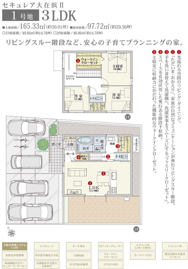 | 建物面積 | 97.72m2(1号地)、97.72m2(2号地) | 土地面積 | 165.33m2(1号地)、159.46m2(2号地) 全て私道負担なし |