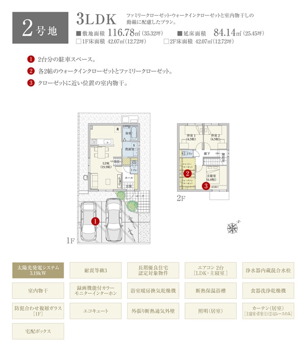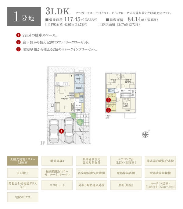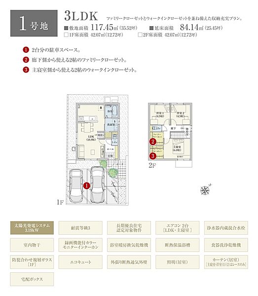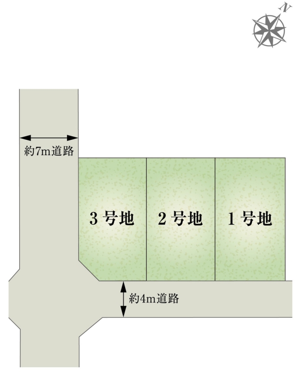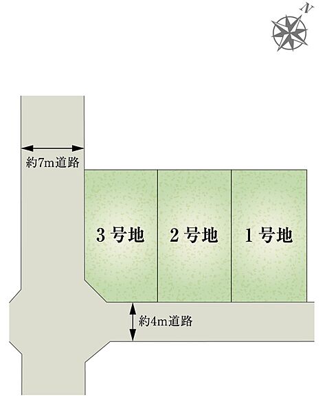 | 建物面積 | 84.14m2(1号地)、84.14m2(2号地)、84.14m2(3号地) | 土地面積 | 117.45m2(1号地)、116.78m2(2号地)、113.09m2(3号地) 私道負担なし |