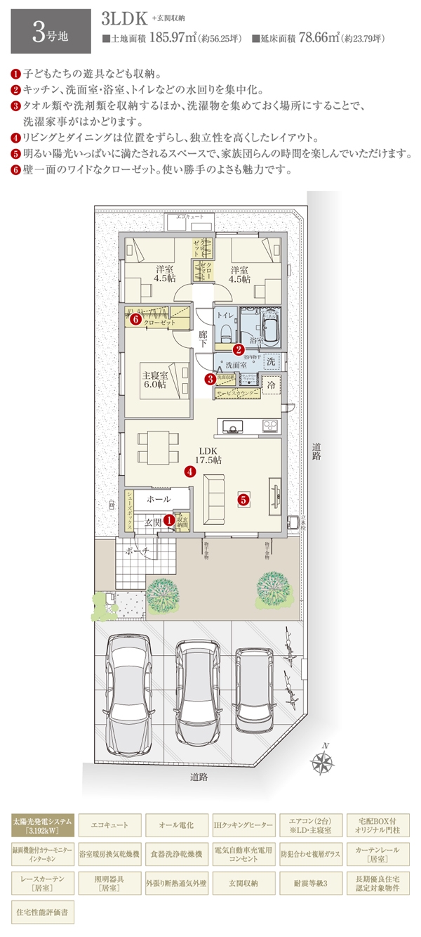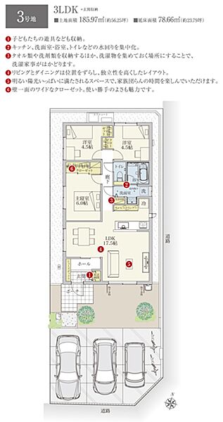 | 建物面積 | 78.66m2(3号地) | 土地面積 | 185.97m2(3号地) 私道負担なし |