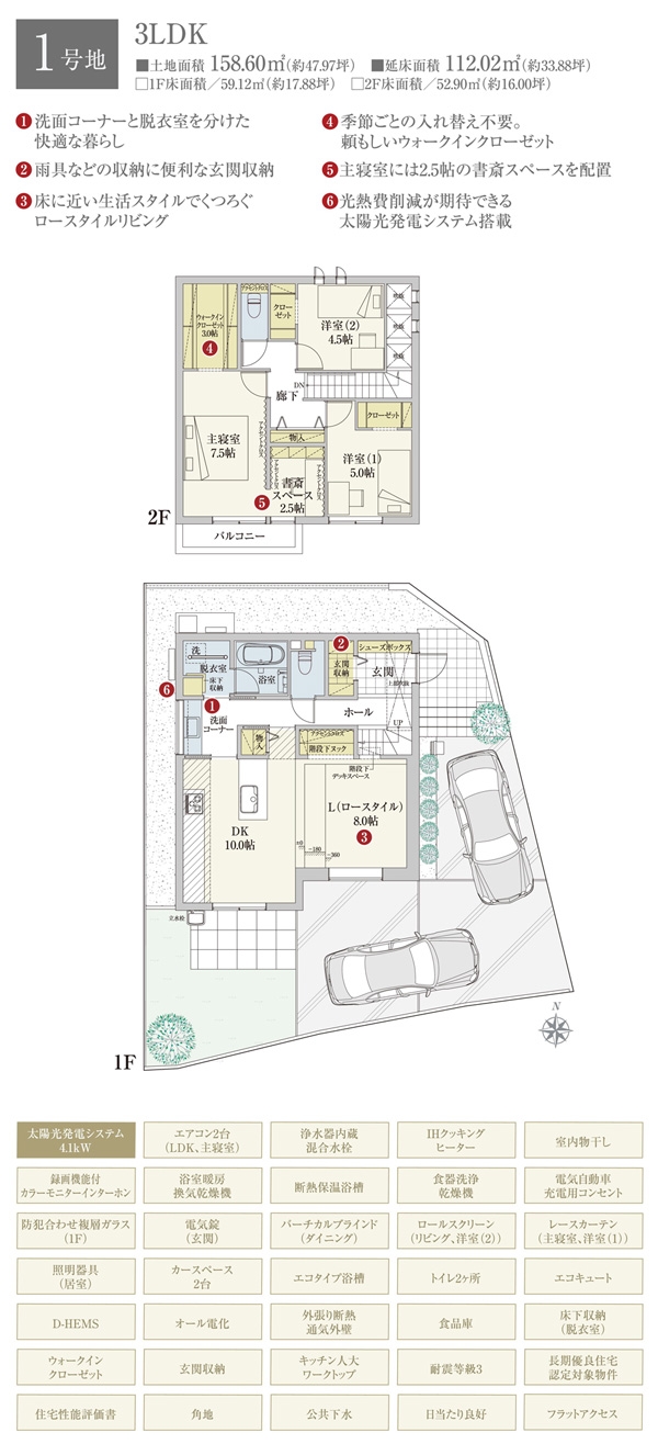 | 建物面積 | 112.02m2(1号地) | 土地面積 | 158.60m2(1号地) 私道負担なし |