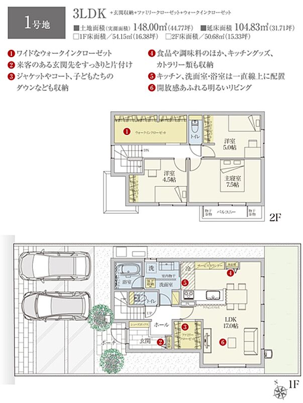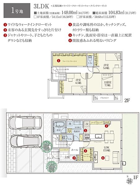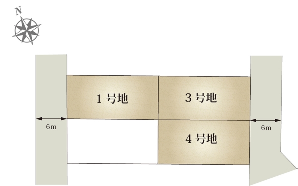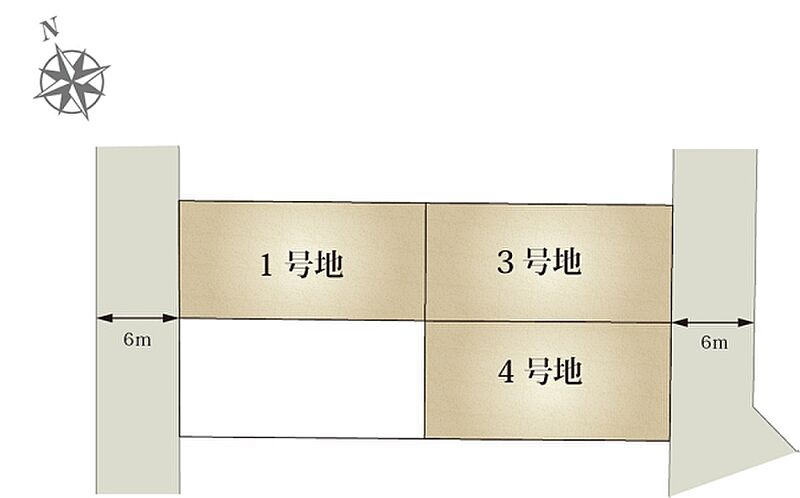 | 建物面積 | 104.83m2(1号地)、101.24m2(3号地)、103.01m2(4号地) | 土地面積 | 148.00m2(1号地)、148.00m2(3号地)、148.00m2(4号地) 全て私道負担なし |