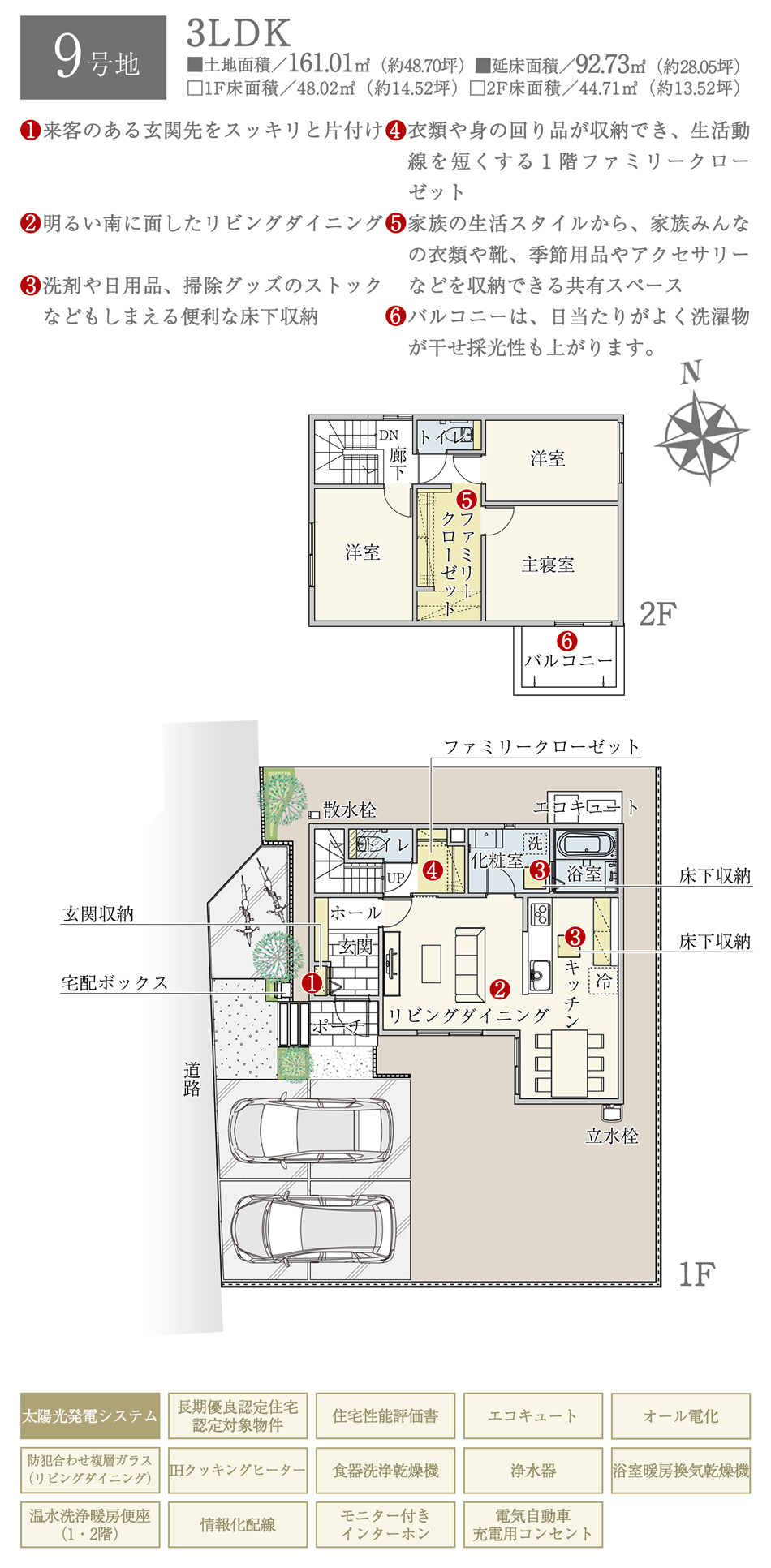 | 建物面積 | 103.50m2(5号地)、92.73m2(9号地)、97.72m2(11号地) | 土地面積 | 165.64m2(5号地)、161.01m2(9号地)、160.05m2(11号地) 私道負担なし |