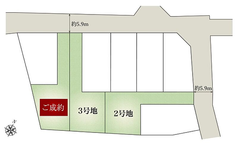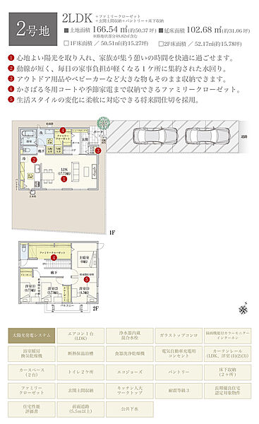 | 建物面積 | 102.68m2(2号地)、101.85m2(3号地) | 土地面積 | 166.54m2(2号地)、169.28m2(3号地) 全て私道負担なし |