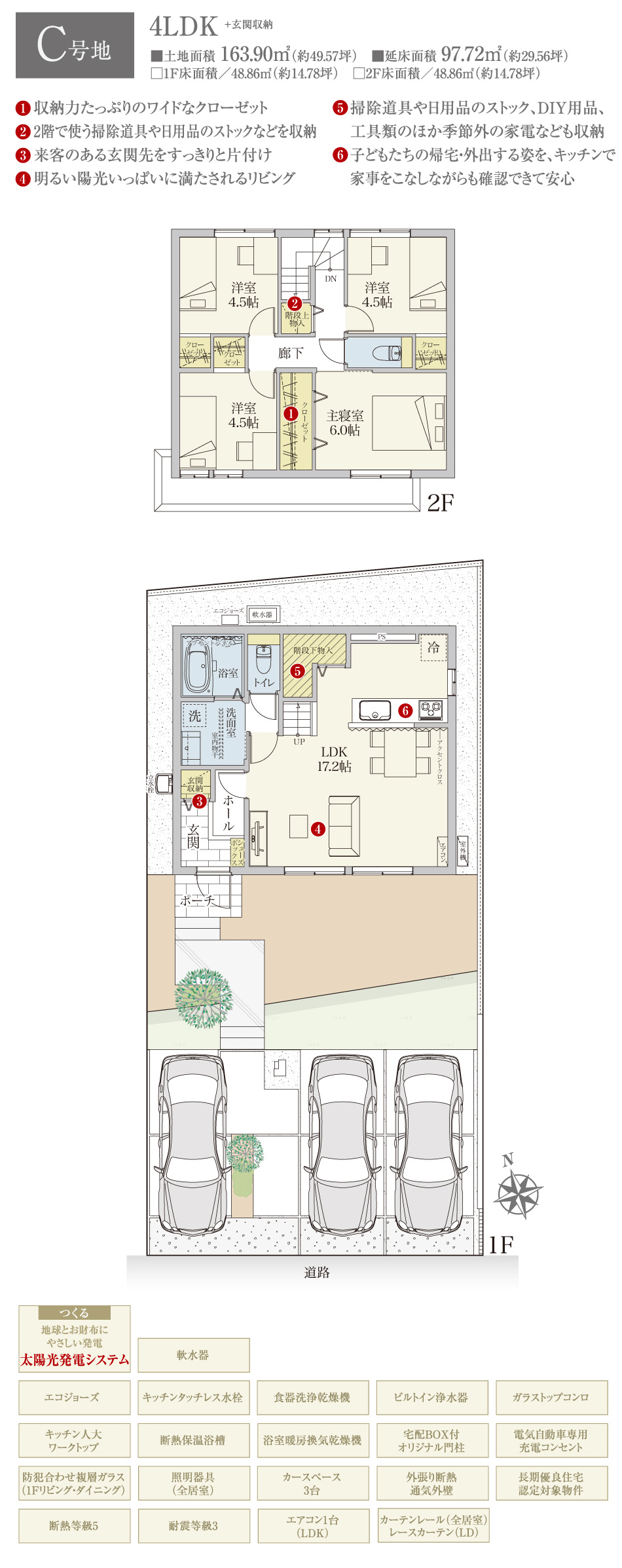 | 建物面積 | 97.72m2(C号地)、97.72m2(G号地)、97.72m2(H号地) | 土地面積 | 163.90m2(C号地)、172.84m2(G号地)、171.27m2(H号地) 私道負担なし |