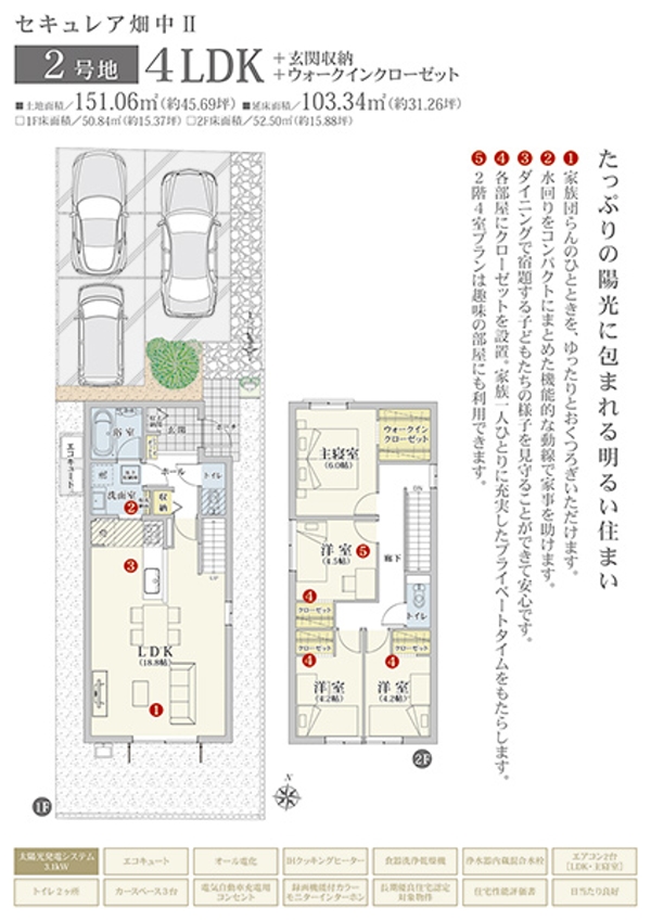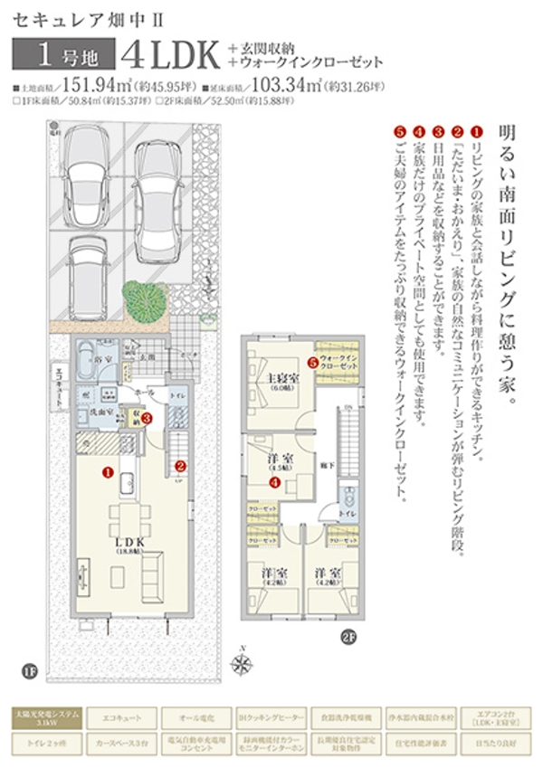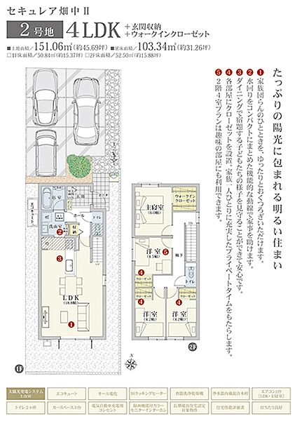 | 建物面積 | 103.34m2(1号地)、103.34m2(2号地) | 土地面積 | 151.94m2(1号地)、151.06m2(2号地) 全て私道負担なし |