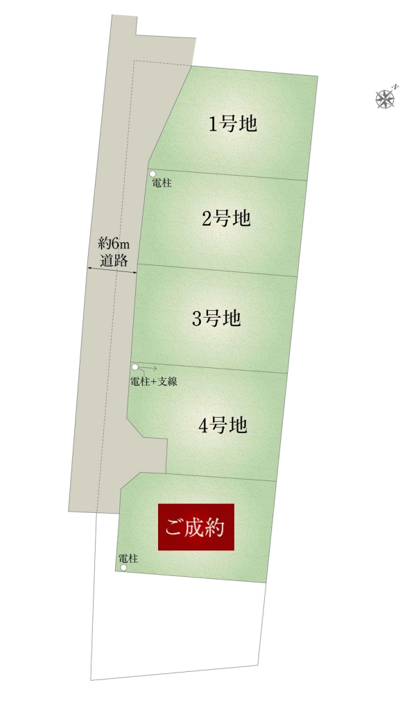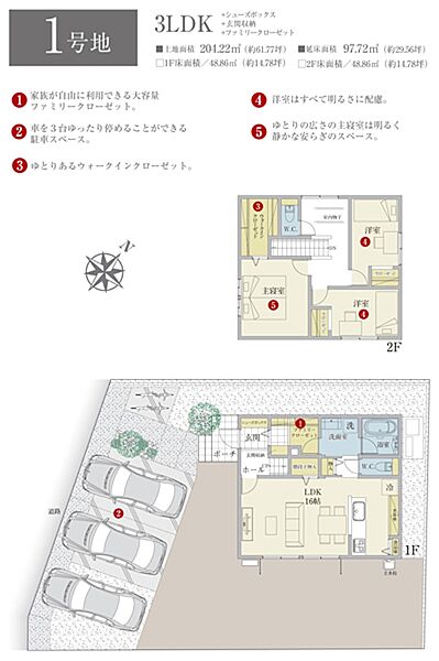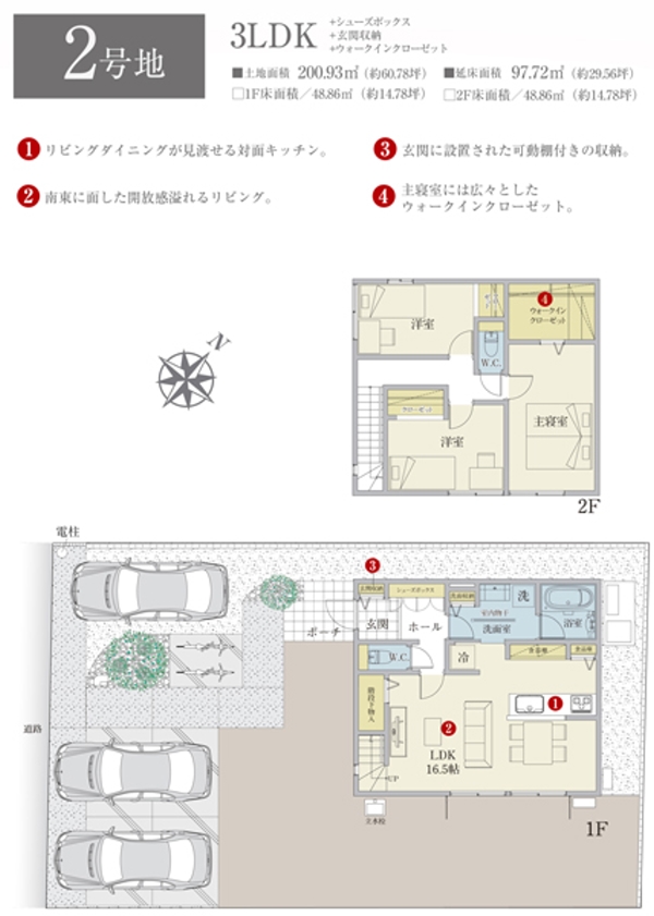 | 建物面積 | 97.72m2(1号地)、97.72m2(2号地)、97.72m2(3号地)、103.01m2(4号地) | 土地面積 | 204.22m2(1号地)、200.93m2(2号地)、201.73m2(3号地)、201.04m2(4号地) 私道負担なし |