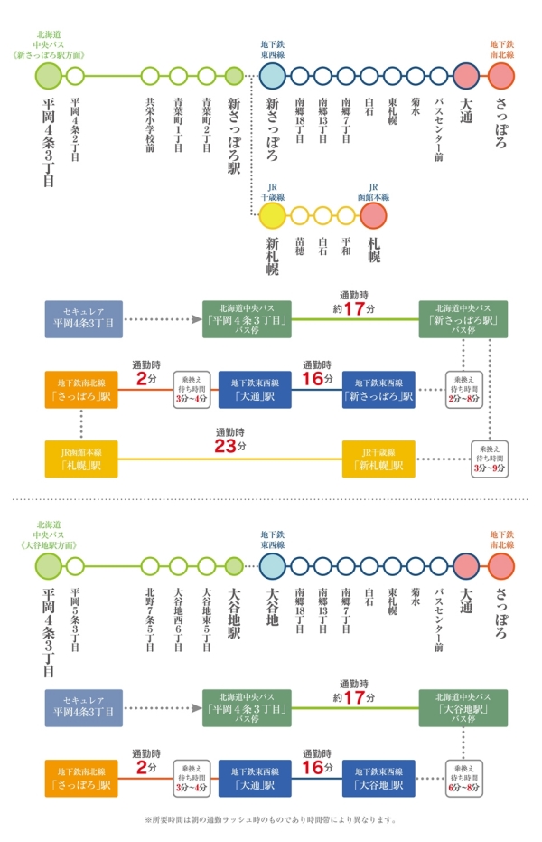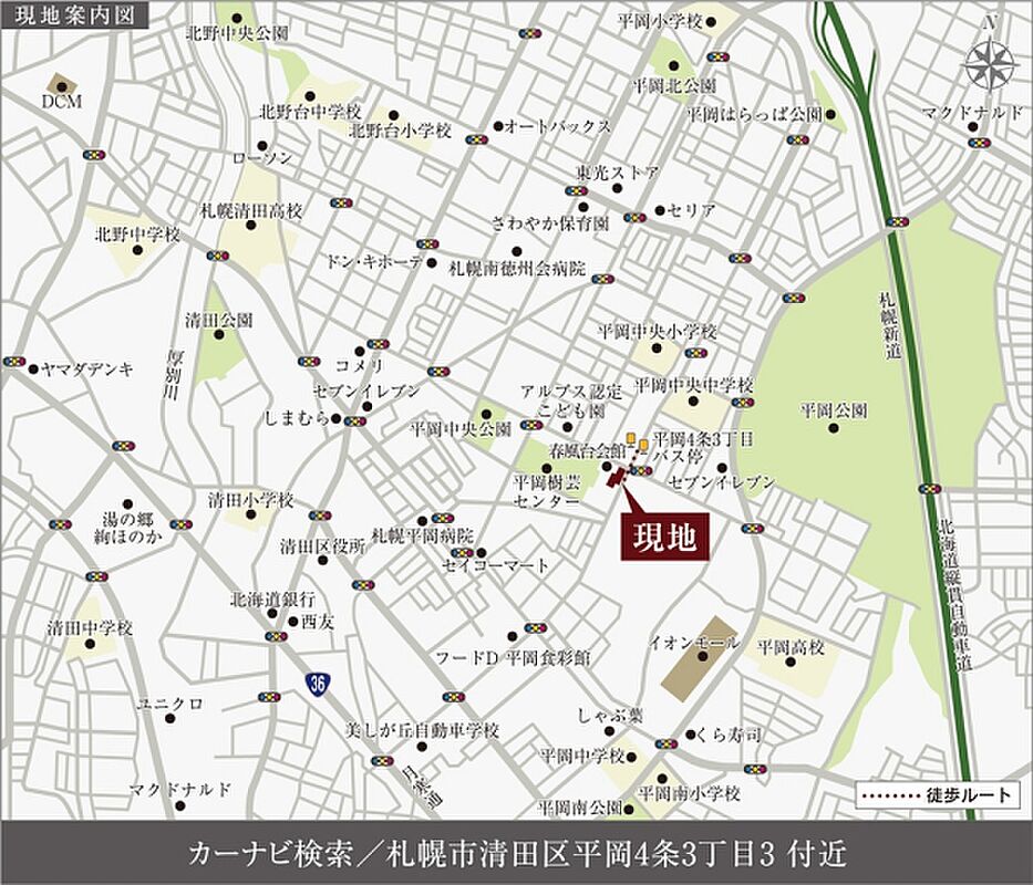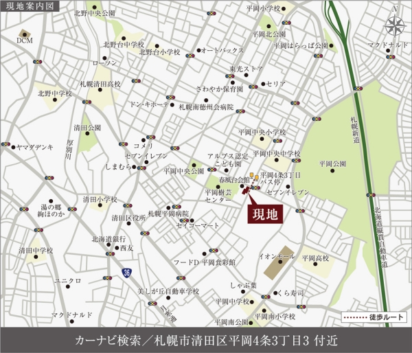 札幌市営東西線「大谷地」駅 徒歩42分~43分 札幌市営東西線「新さっぽろ」駅 徒歩61分~62分 |