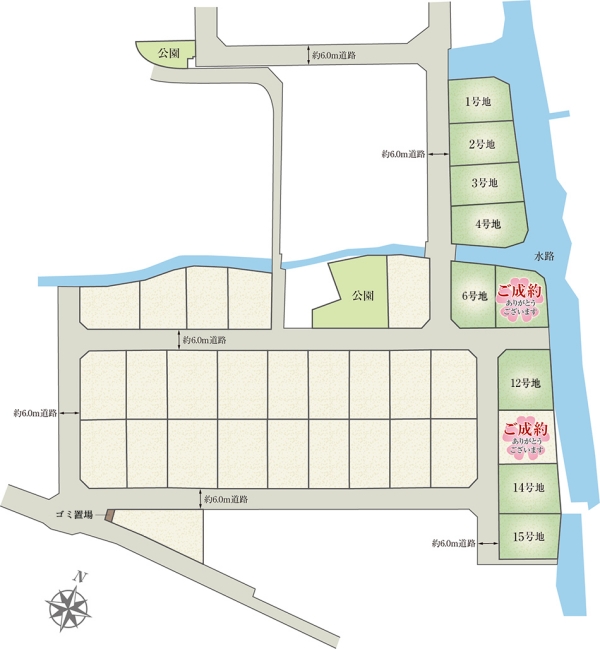 | 建物面積 | 76.01m2(2号地、6号地)~97.72m2(15号地) | 土地面積 | 183.71m2(1号地)~219.20m2(4号地) 全て私道負担なし |