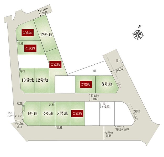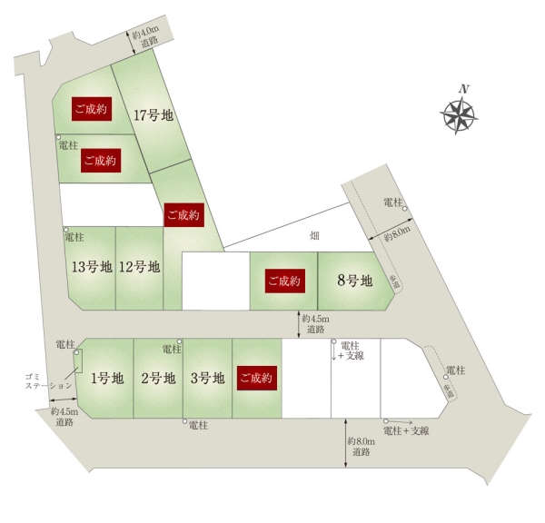 | 建物面積 | 87.77m2(17号地)~96.05m2(8号地) | 土地面積 | 102.10m2(2号地、3号地)~135.38m2(17号地) 全て私道負担なし |