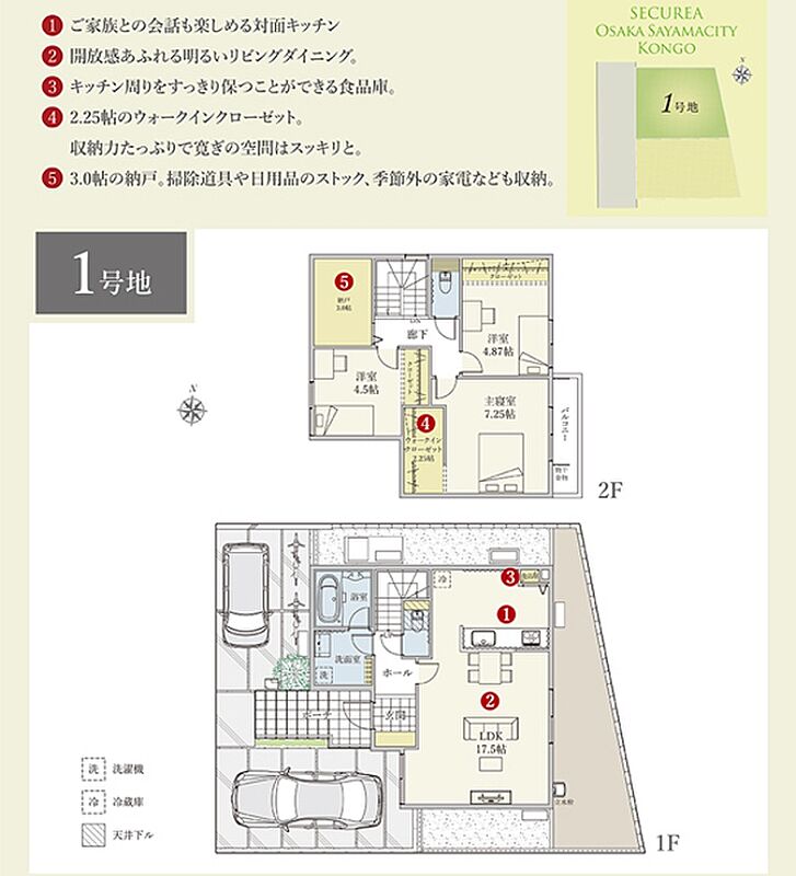 | 建物面積 | 98.05m2(1号地) | 土地面積 | 127.18m2(1号地) 私道負担なし |
