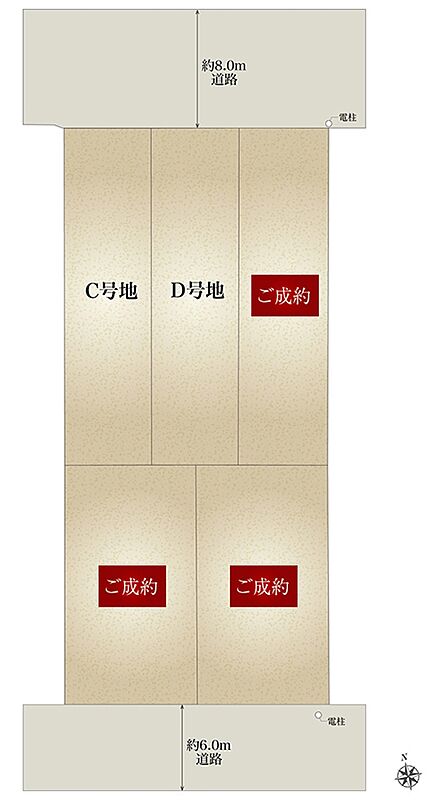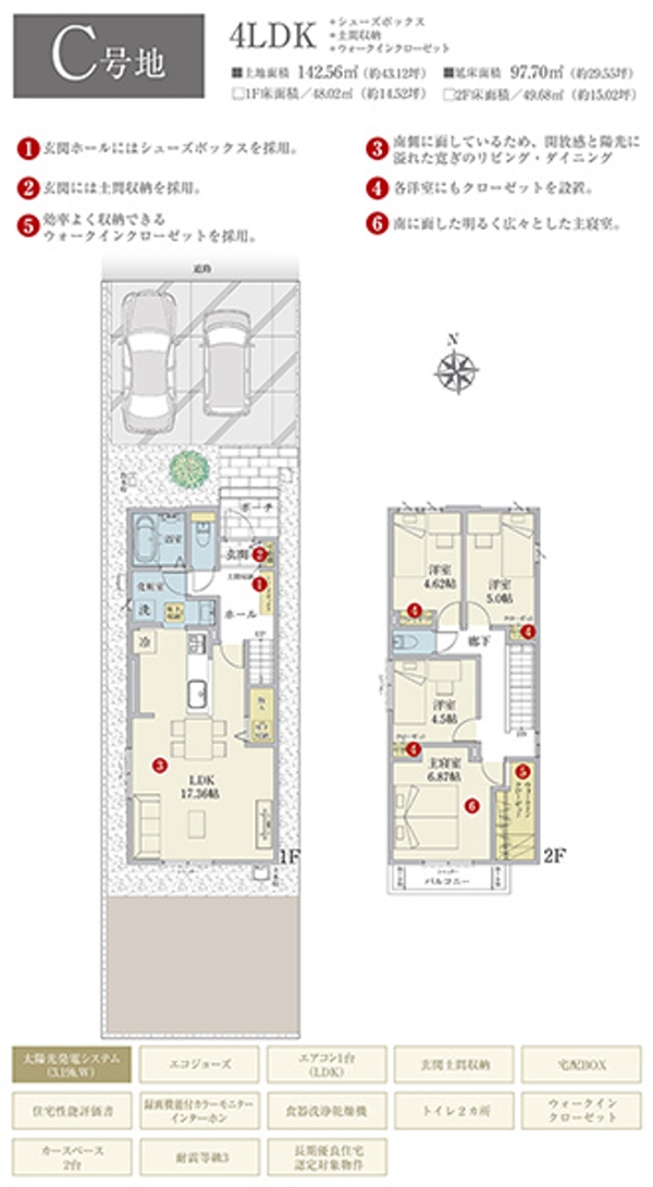 | 建物面積 | 97.70m2(C号地)、97.70m2(D号地) | 土地面積 | 142.56m2(C号地)、142.43m2(D号地) 全て私道負担なし |