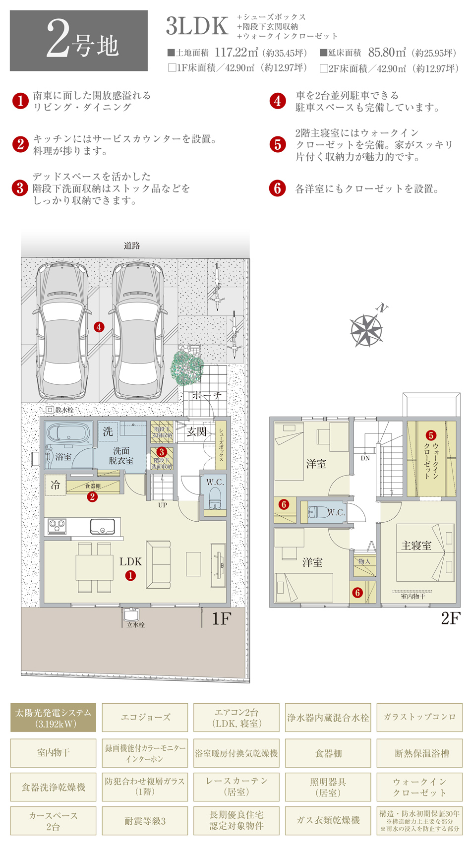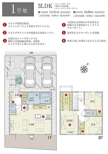 | 建物面積 | 85.80m2(1号地)、85.80m2(2号地) | 土地面積 | 114.51m2 私道負担あり 495m2のうち、960分の1の負担持分(1号地)、117.22m2 私道負担あり 495m2のうち、960分の1の負担持分(2号地) |