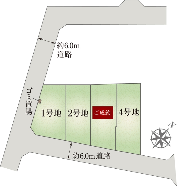 | 建物面積 | 97.70m2(1号地)、89.42m2(2号地)、91.08m2(4号地) | 土地面積 | 175.85m2(1号地)、162.84m2(2号地)、185.72m2(4号地) 私道負担なし |