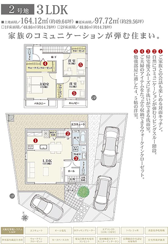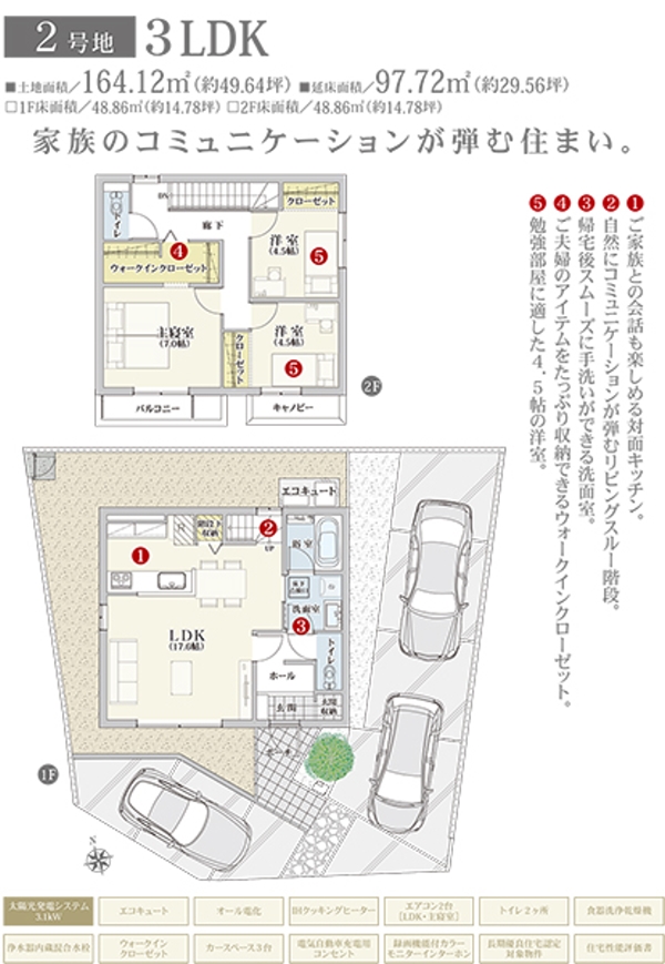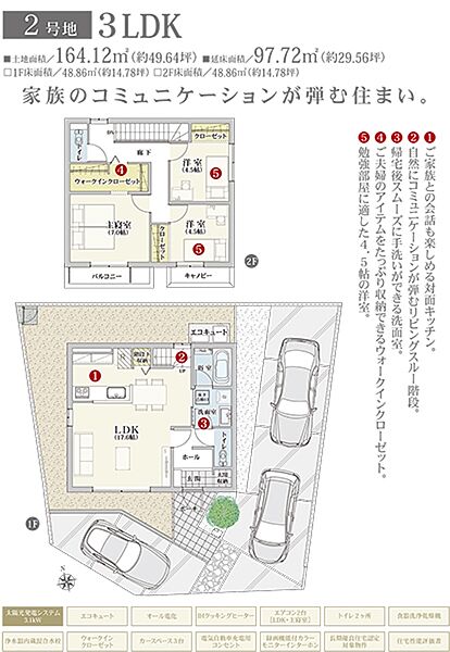 | 建物面積 | 97.72m2(2号地) | 土地面積 | 164.12m2(2号地) 私道負担なし |
