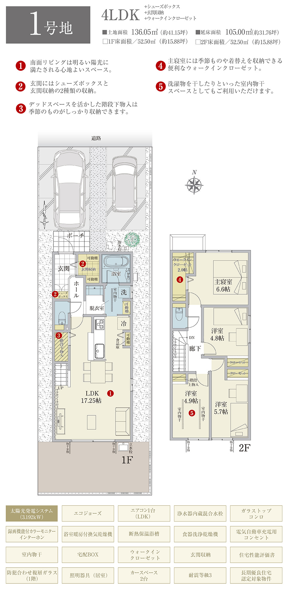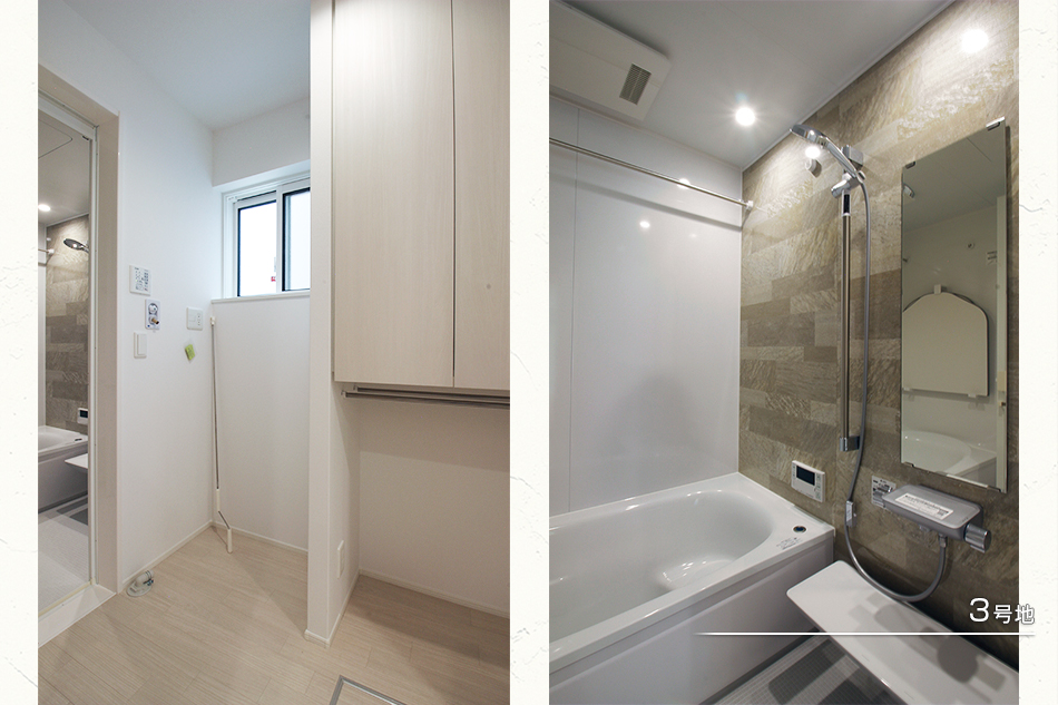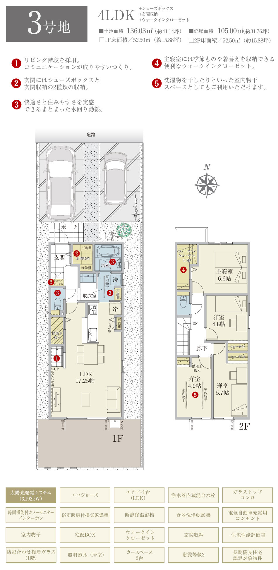 | 建物面積 | 105.00m2(1号地)、105.00m2(2号地)、105.00m2(3号地) | 土地面積 | 136.05m2(1号地)、136.01m2(2号地)、136.03m2(3号地) 私道負担なし |