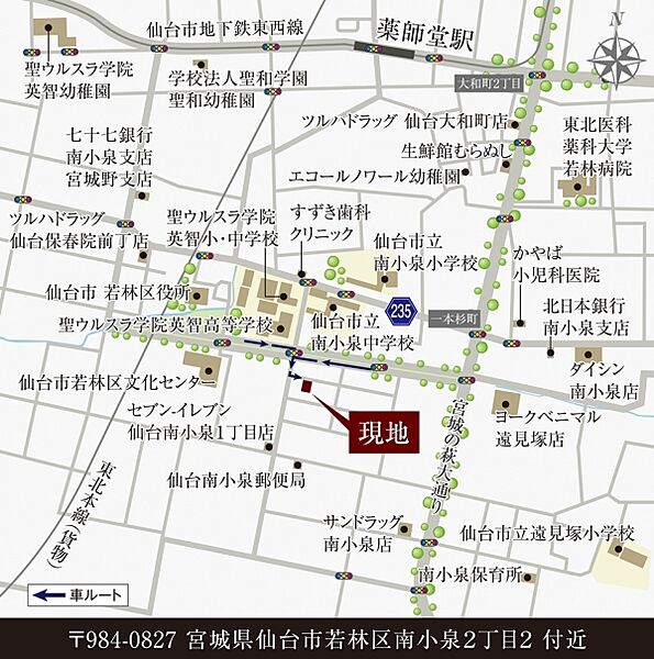 仙台市地下鉄東西線「薬師堂」駅まで徒歩14分、国道4号線まで車で約4分とお出かけや通勤にも便利な立地