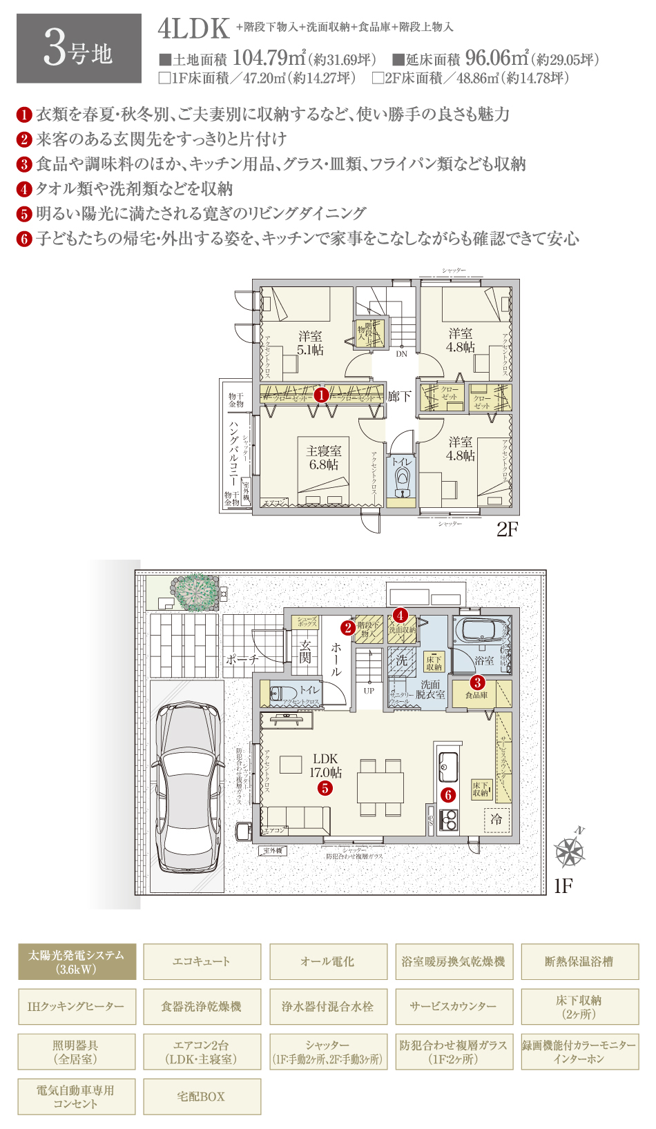 | 建物面積 | 96.06m2(3号地) | 土地面積 | 104.79m2 私道負担あり 143m2のうち、4分の1の負担持分(3号地) |