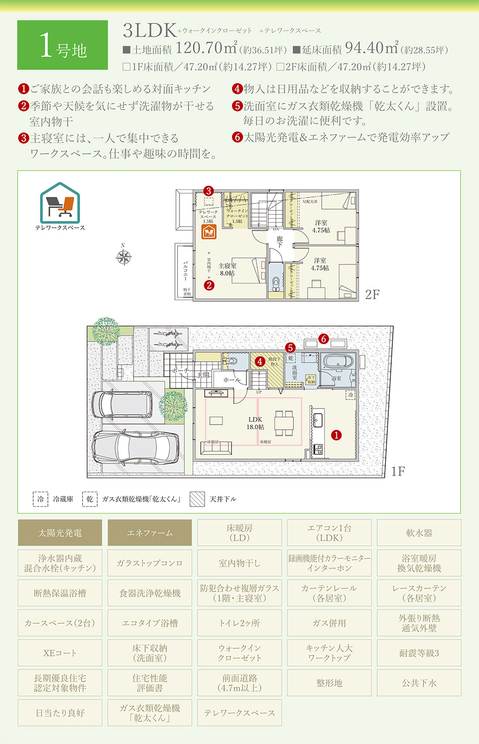 | 建物面積 | 94.40m2(1号地) | 土地面積 | 120.70m2(1号地) 私道負担なし |