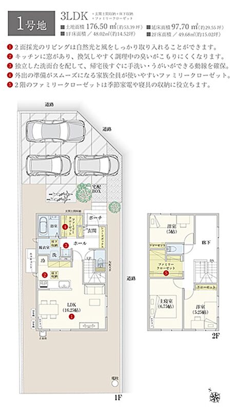| 建物面積 | 97.70m2(1号地) | 土地面積 | 176.50m2(1号地) 私道負担なし |