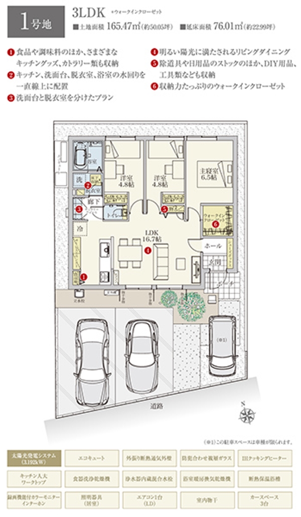 | 建物面積 | 76.01m2(1号地) | 土地面積 | 165.47m2(1号地) 私道負担なし |