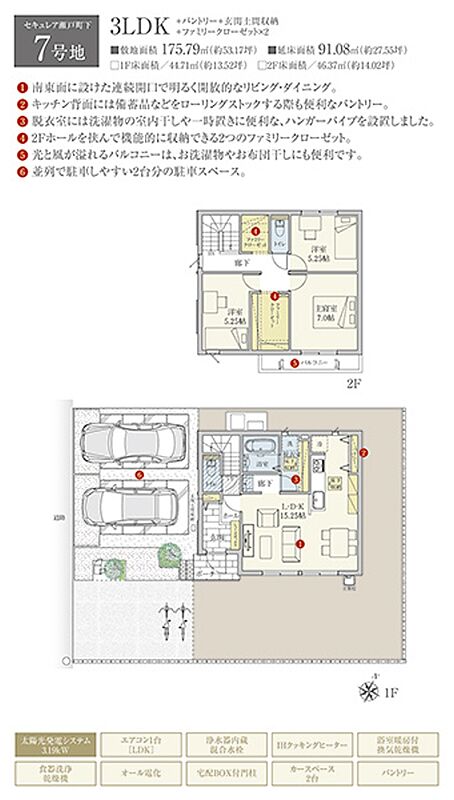 | 建物面積 | 91.08m2(6号地)、91.08m2(7号地) | 土地面積 | 175.78m2(6号地)、175.79m2(7号地) 全て私道負担なし |