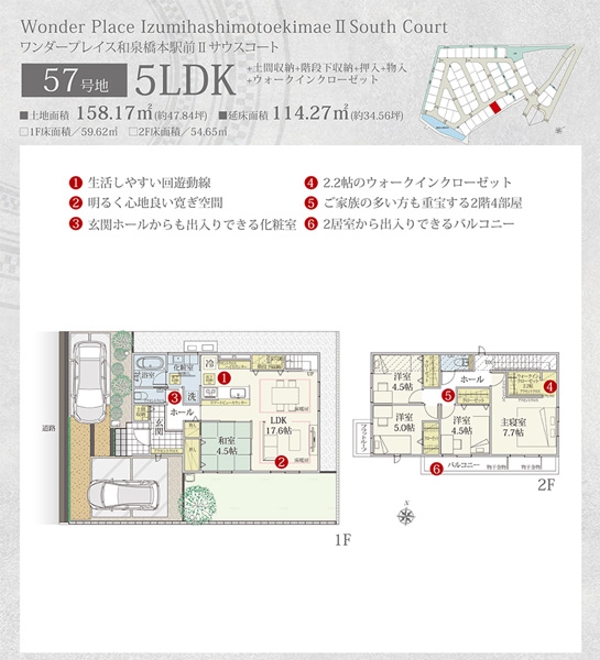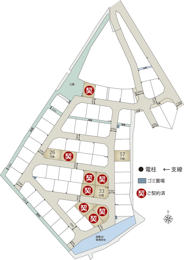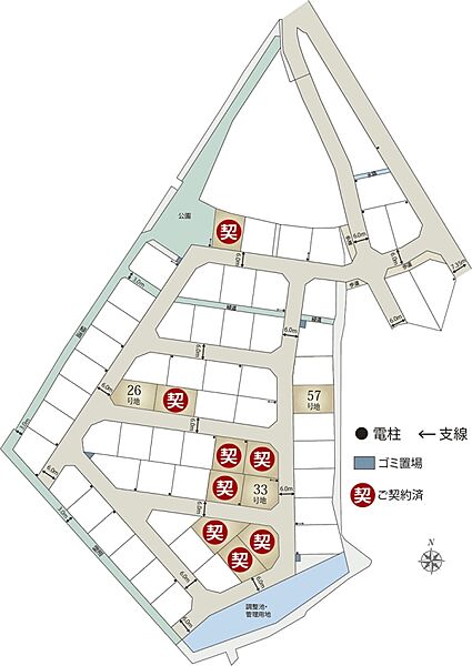 | 建物面積 | 118.80m2(26号地)、108.47m2(33号地)、114.27m2(57号地) | 土地面積 | 153.16m2(26号地)、152.50m2(33号地)、158.17m2(57号地) 私道負担なし |