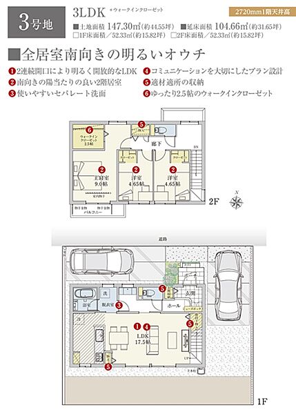 | 建物面積 | 94.98m2(2号地)、104.66m2(3号地) | 土地面積 | 109.18m2(2号地)、147.30m2(3号地) 全て私道負担なし |