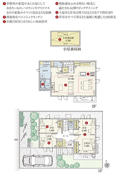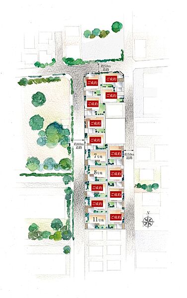 | 建物面積 | 90.26m2(7号地)、91.08m2(8号地)、92.53m2(11号地) | 土地面積 | 117.79m2(7号地)、117.80m2(8号地)、117.90m2(11号地) 私道負担なし |