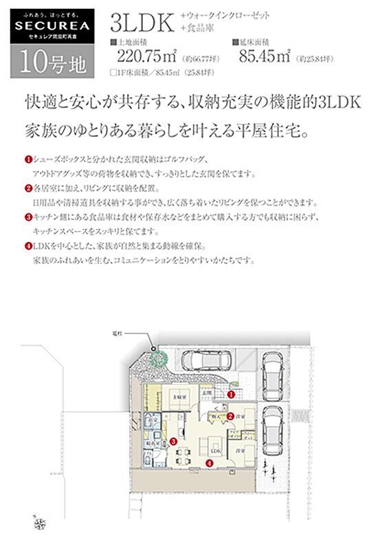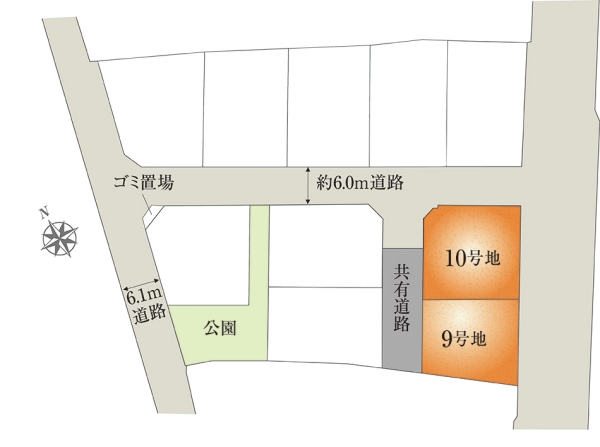 | 建物面積 | 86.11m2(9号地)、85.45m2(10号地) | 土地面積 | 193.88m2 私道負担あり 123.95m2のうち、2分の1の負担持分(9号地)、220.75m2 私道負担なし(10号地) |