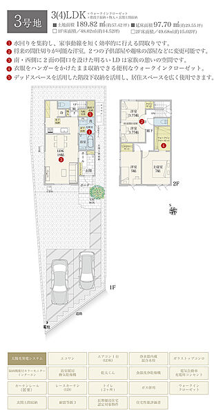 | 建物面積 | 89.42m2(2号地)、97.70m2(3号地) | 土地面積 | 150.44m2(2号地)、189.82m2(3号地) 全て私道負担なし |