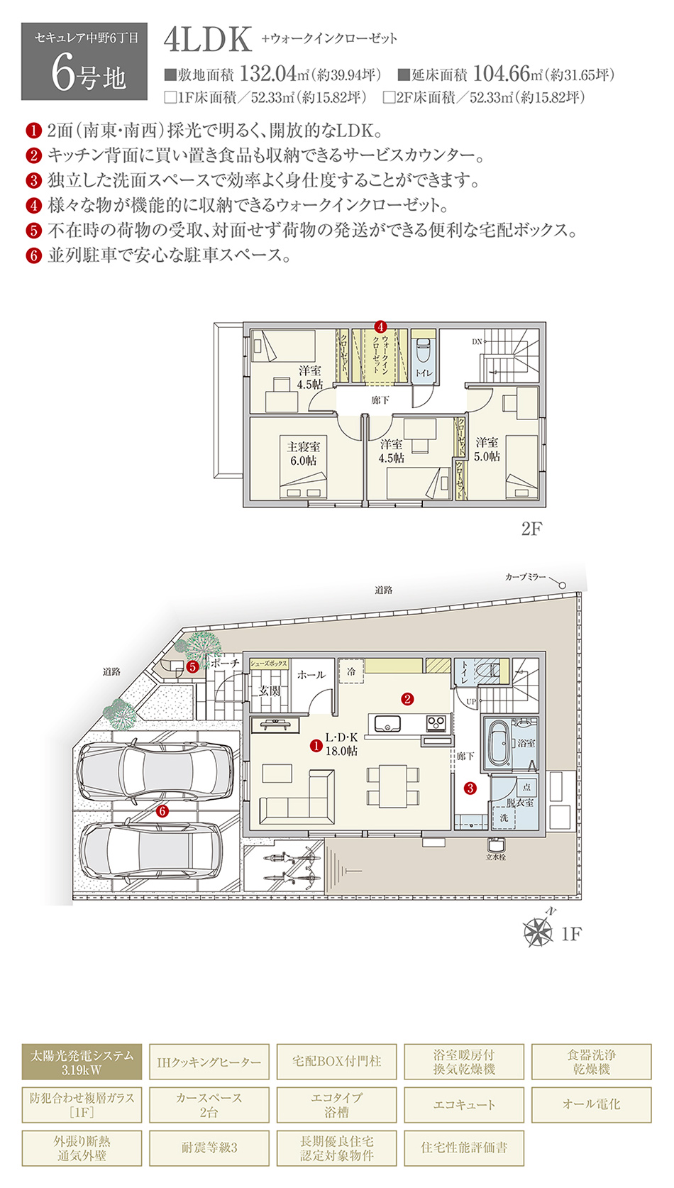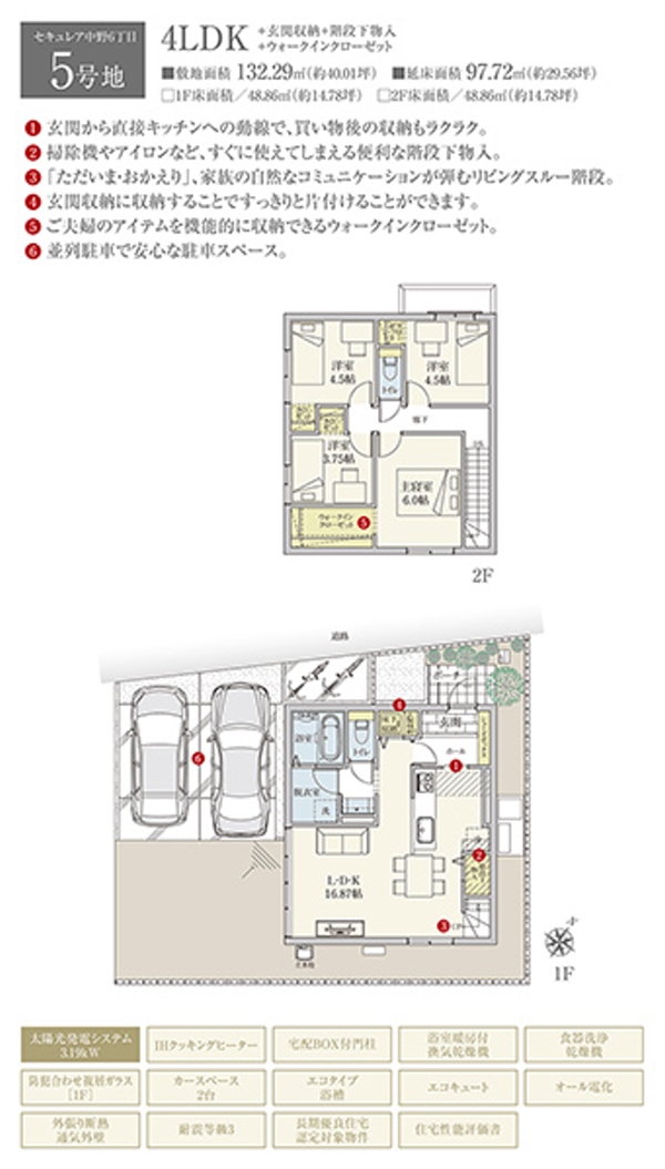 | 建物面積 | 97.72m2(5号地)、104.66m2(6号地) | 土地面積 | 132.29m2(5号地)、132.04m2(6号地) 全て私道負担なし |