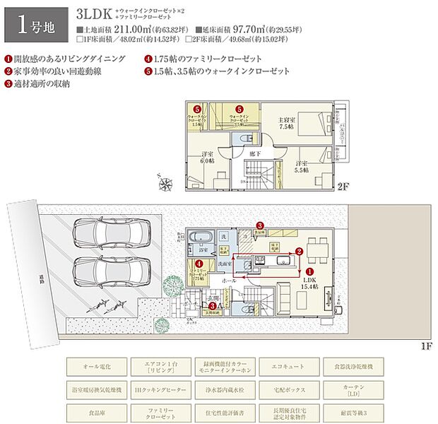 | 建物面積 | 97.70m2(1号地) | 土地面積 | 211.00m2(1号地) 私道負担なし |
