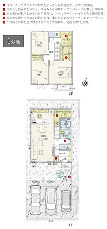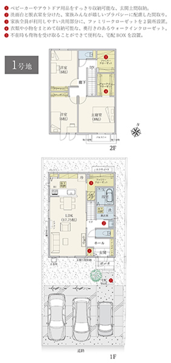 | 建物面積 | 104.34m2(1号地)、104.34m2(2号地)、104.34m2(3号地)、102.68m2(6号地) | 土地面積 | 152.16m2(1号地)、147.57m2(2号地)、151.57m2(3号地)、153.67m2(6号地) 私道負担なし |