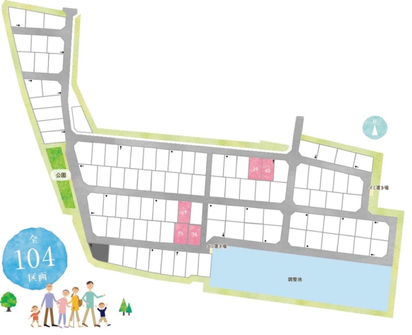 | 建物面積 | 104.33m2(39号地)、102.68m2(40号地)、109.64m2(67号地)、84.62m2(75号地)、85.29m2(76号地) | 土地面積 | 200.46m2(39号地)、200.56m2(40号地)、200.00m2(67号地)、200.00m2(75号地)、200.00m2(76号地) 私道負担なし |