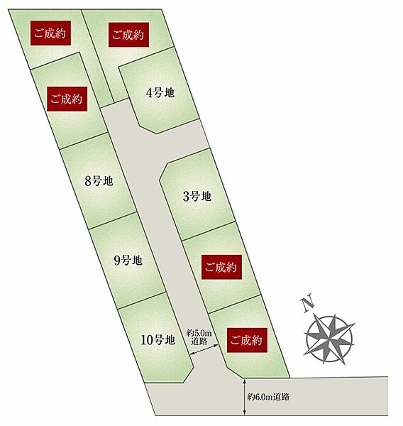 | 建物面積 | 87.78m2(3号地)、87.78m2(4号地)、89.28m2(8号地)、89.28m2(9号地)、89.44m2(10号地) | 土地面積 | 113.03m2(3号地)、113.01m2(4号地)、113.02m2(8号地)、113.01m2(9号地)、113.02m2(10号地) 私道負担なし |