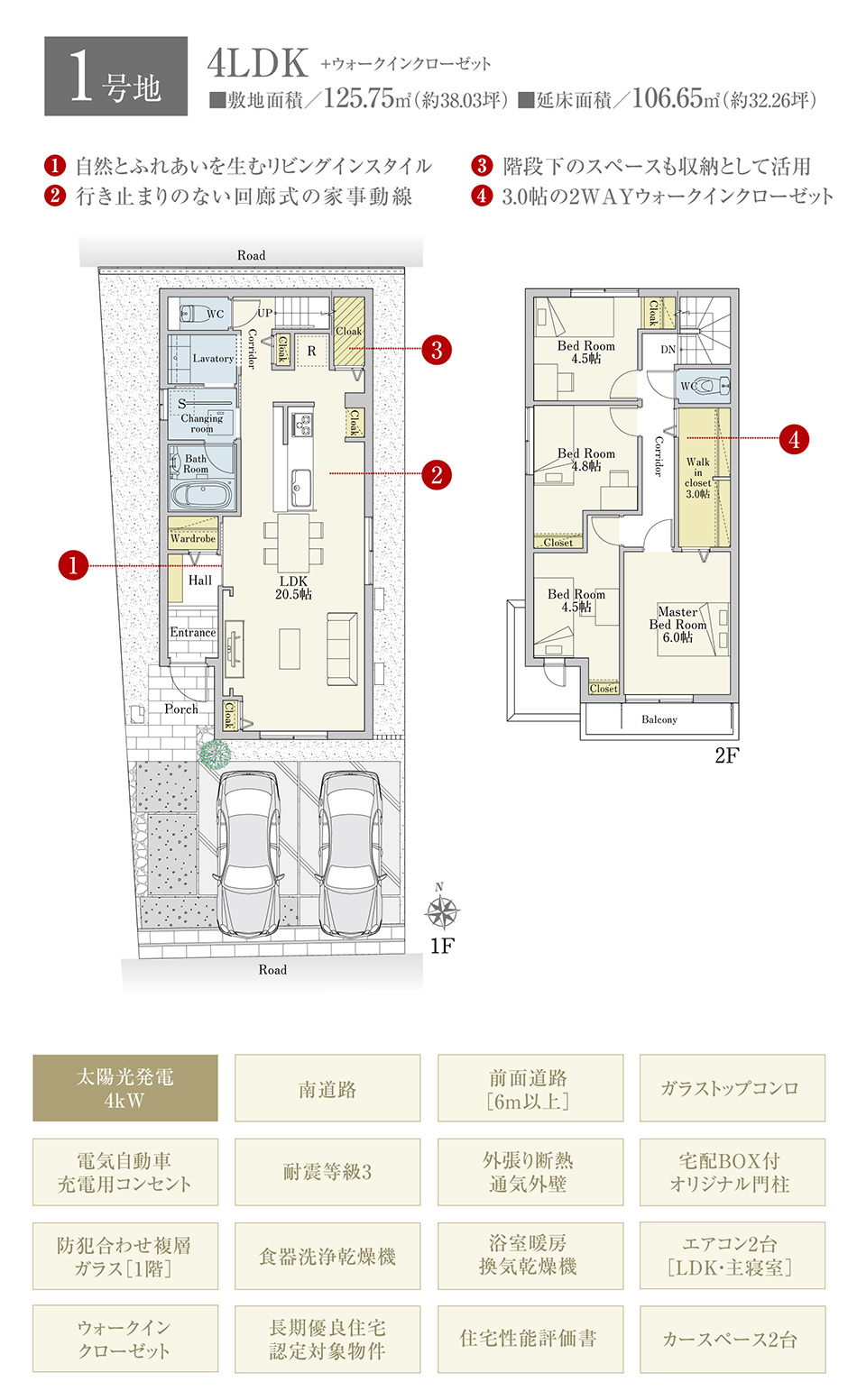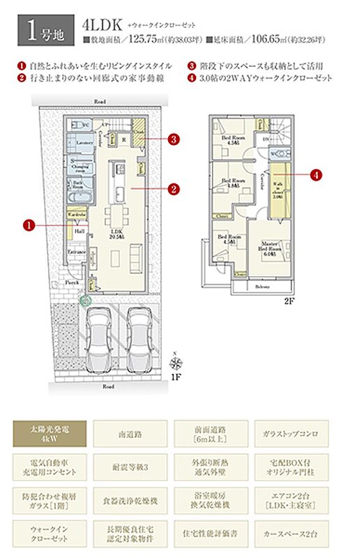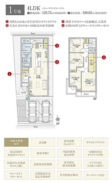 | 建物面積 | 106.65m2(1号地) | 土地面積 | 125.75m2(1号地) 私道負担なし |