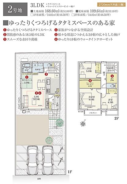 | 建物面積 | 109.64m2(2号地) | 土地面積 | 168.60m2(2号地) 私道負担なし |