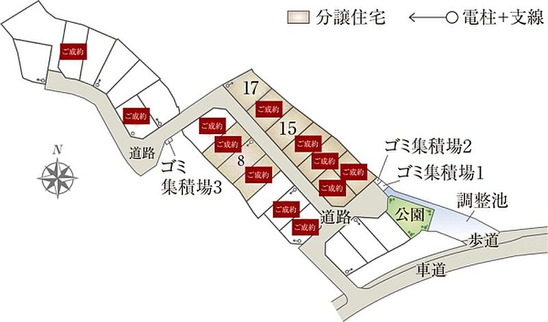 | 間取り | 3LDK(8号地、17号地)、4LDK(15号地) | 建物構造 | 軽量鉄骨2階建(3戸) |