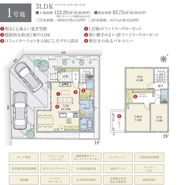 | 建物面積 | 92.73m2(1号地)、92.73m2(2号地) | 土地面積 | 122.29m2(1号地)、132.46m2(2号地) 全て私道負担なし |