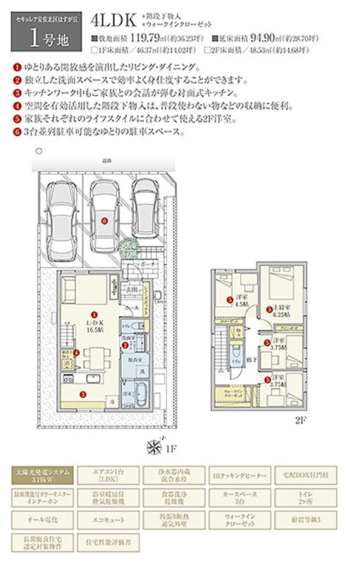 | 建物面積 | 94.90m2(1号地) | 土地面積 | 119.79m2(1号地) 私道負担なし |