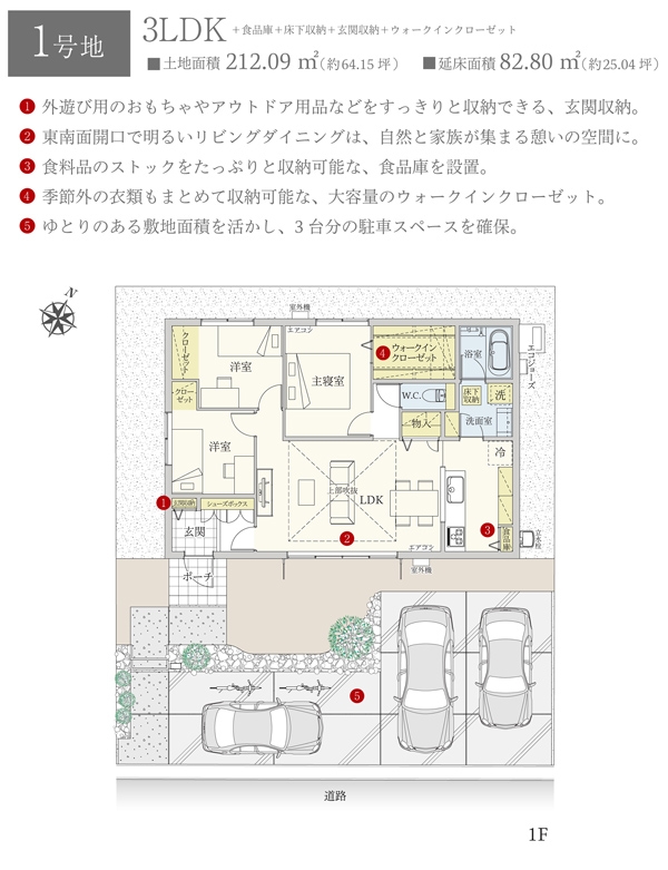 | 建物面積 | 82.80m2(1号地) | 土地面積 | 212.09m2(1号地) 私道負担なし |