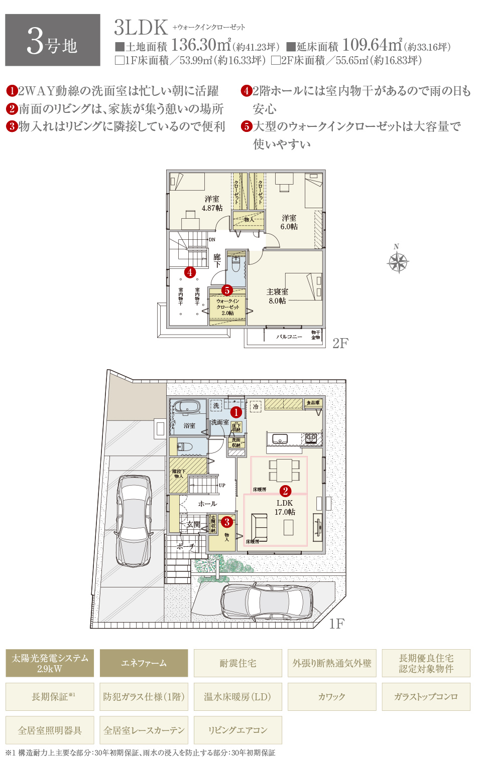 | 建物面積 | 109.64m2(1号地)、106.32m2(2号地)、109.64m2(3号地) | 土地面積 | 136.30m2(1号地)、136.30m2(2号地)、136.30m2(3号地) 全て私道負担なし |