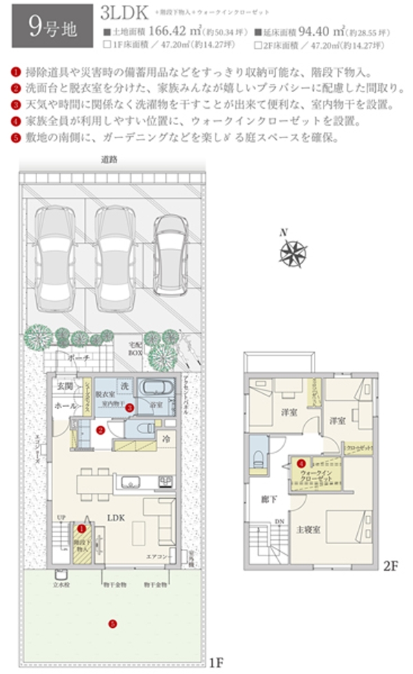 | 建物面積 | 94.40m2(6号地)、93.16m2(7号地)、94.40m2(8号地)、94.40m2(9号地)、93.16m2(10号地) | 土地面積 | 166.43m2(6号地)、166.41m2(7号地)、166.40m2(8号地)、166.42m2(9号地)、166.40m2(10号地) 私道負担なし |