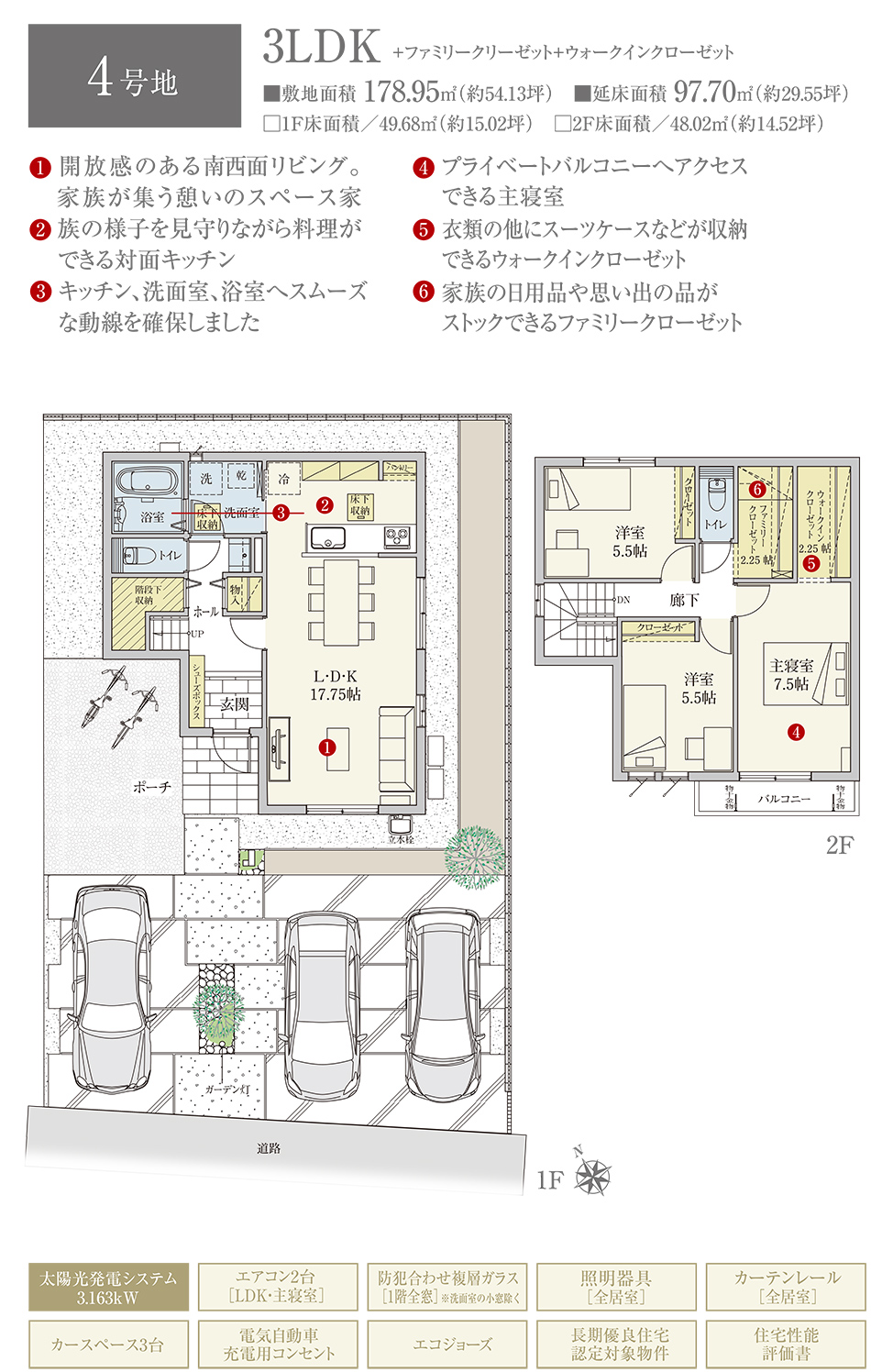 | 建物面積 | 97.70m2(4号地)、107.65m2(5号地) | 土地面積 | 178.95m2(4号地)、177.49m2(5号地) 全て私道負担なし |